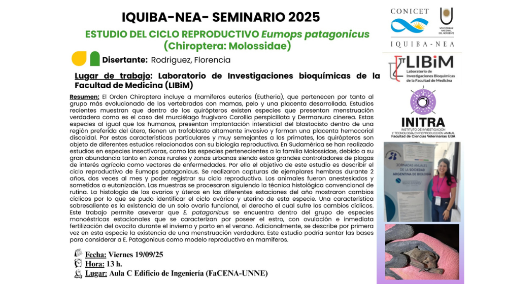 En el marco del ciclo de seminarios 2025 del Instituto de Química Básica y Aplicada del Nordeste Argentino (IQUIBA-NEA, CONICET-UNNE), el viernes 19 de septiembre en el Aula C del edificio de Ingeniería de la Facultad de Ciencias Exactas y Naturales y Agrimensura (FaCENA-UNNE) se desarrolló la disertación titulada “Estudio del ciclo reproductivo Eumops patagonicus (Chiroptera: Molossidae) ”, dictado por Florencia Evelyn Rodríguez, becaria doctoral del CONICET, quien se desempeña en el Laboratorio de Investigaciones Bioquímicas, de la Facultad de Medicina (LIBiM).